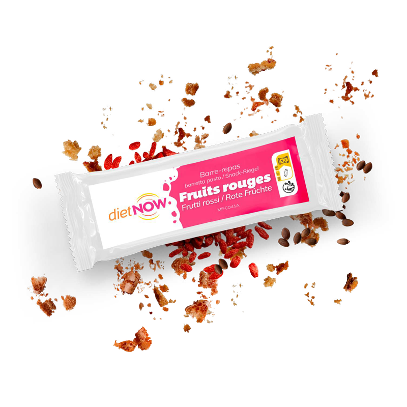 Barretta sostitutiva del pasto a base di bacche di Goji e semi di zucca, gusto melograno; con base di cioccolato al latte.